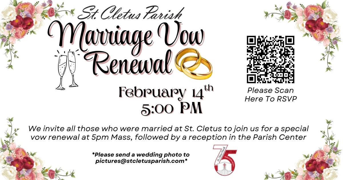 St. Cletus Church 600 W. 55th Street, La Grange, IL, United StatesWe invite all those who were married at St. Cletus to join us for a special vow renewal at 5pm Mass, followed by a reception in the Parish Center