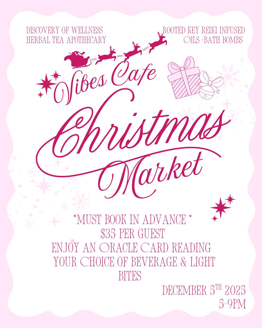 Vibes Cafe 26 S. La Grange Road, La Grange, IL, United StatesVibes Cafe is hosting their Christmas Market on December 5, 2025 from 5pm - 9pm. Discoverery of Wellness, Herbal Tea Apothecary, Rooted Key Reiki Infused Oils and Bathbombs Must book in advance - $35 per guest. Enjoy an oracle card reading, and enjoy your choice of beverage and light bites.