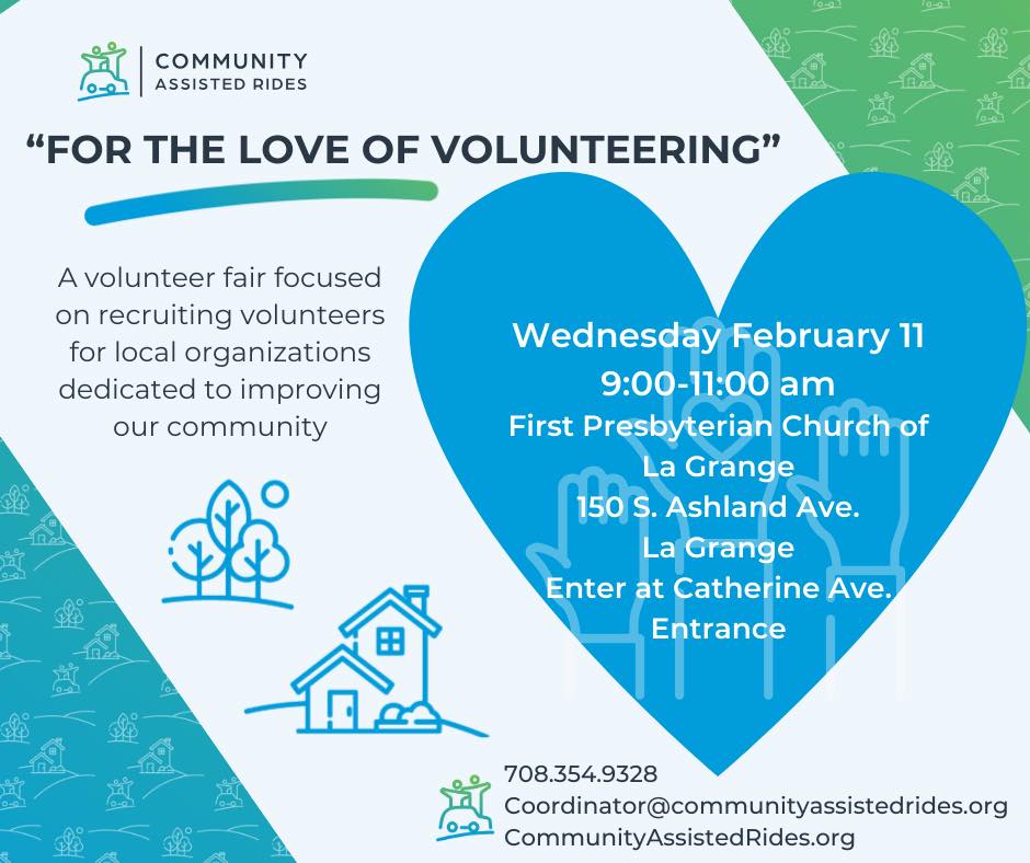 Westminster Hall (First Presbyterian Church of La Grange) 150 S. Ashland Avenue, La Grange, IL, United StatesCARS is thrilled to host our third annual "For the Love of Volunteering" fair.  A volunteer fair focused on highlighting organizations that are dedicated to improving our community by enabling community members to hear about volunteer opportunities.  This event is scheduled at the CARS offices, for Wednesday, February 11, 2026 9:00-11:00 am in Westminster Hall at First Presbyterian Church of La Grange. Last year, 12 community groups […]