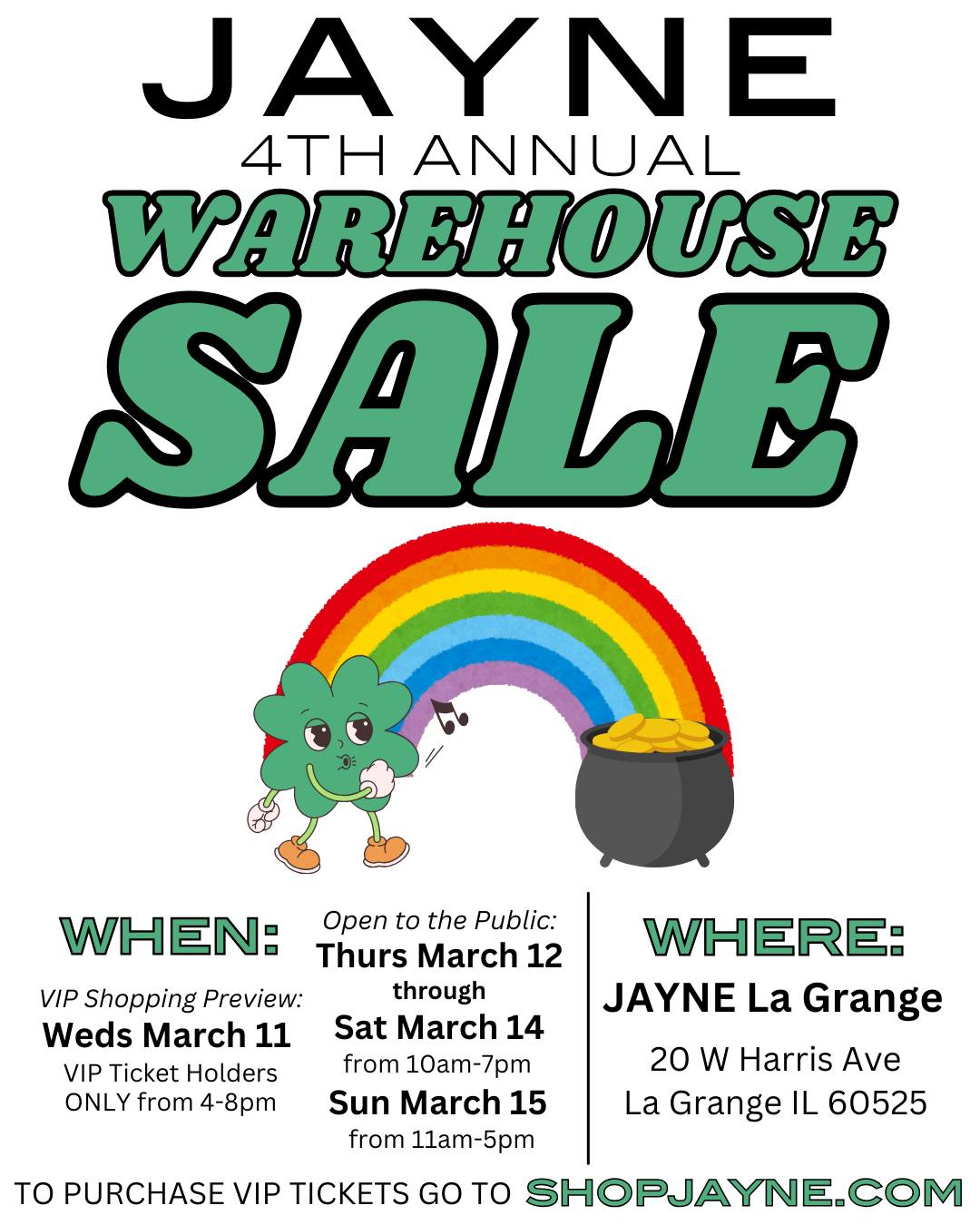 It’s here! JAYNE’s 4th Annual Warehouse Sale is back and better than ever! Score amazing finds, shop early with VIP access, and chase the rainbow to your pot of gold savings. Shop footwear from all your favorite brands, plus tons of clothing and accessories.Mark your calendars...It all starts with VIP night on Weds March 11. Grab […] |