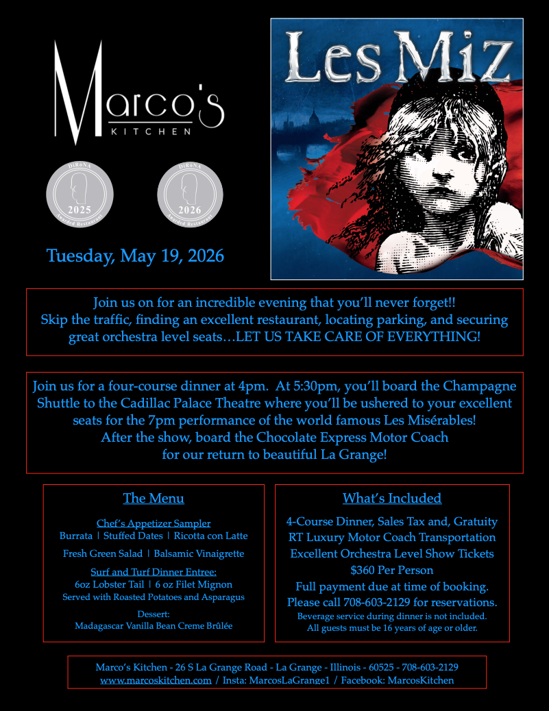 Call or visit Marco's Kitchen to purchase tickets: 708-603-2129. DETAILS: Join us for a four-course dinner at 4 pm. At 5:30, you'll board the Champagne Shuttle to the Cadillac Palace Theater […] |