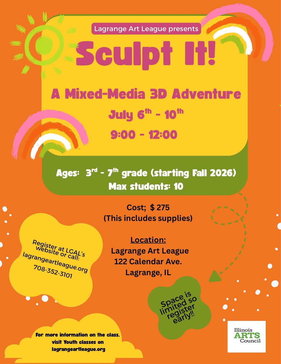La Grange Art League 122 Calendar Drive, La Grange, IL, United StatesJoin us for a one week summer art class from July 6th - 10th for 3rd - 7th grade (starting in fall 2026). Students will be exploring 3 dimensional art […]