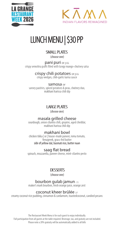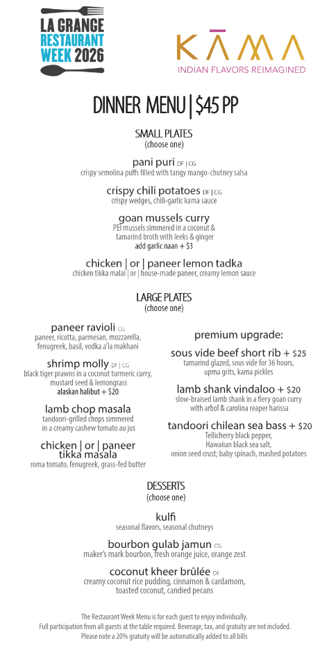 Kama is a modern Indian bistro in La Grange offering reimagined Indian flavors through a contemporary dining lens. The menu blends traditional spices and techniques with thoughtful presentation and approachable formats, paired with craft cocktails and a curated wine list. With a warm yet refined atmosphere, Kama delivers a globally inspired dining experience suited for both casual evenings and special occasions.